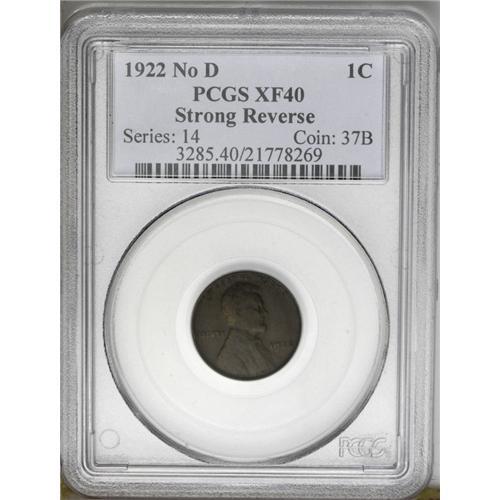 <B>1922 No D<1C> Strong Reverse XF40 PCGS.</B></I> A chocolate-brown cent that has typically bold details on the reverse, while IN GOD WE TRUST is sharper than usually encountered. Lincoln's portrait shows a trace of dark gray patina at certain angles. An impressive example of this coveted key date.