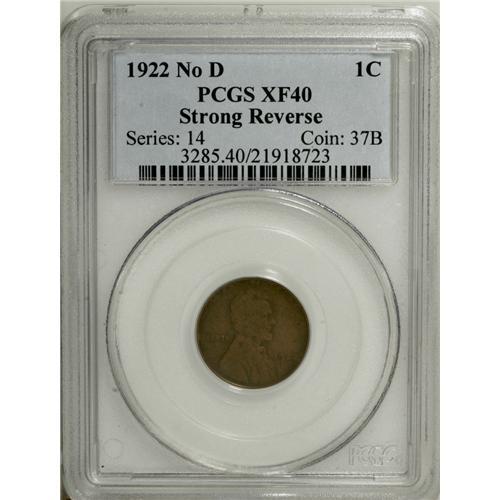 <B>1922 No D 1C Strong Reverse XF40 PCGS.</B></I> FS-013.2. Die Pair 2. This Strong Reverse example of the popular No D die variety is noteworthy for the strength of the obverse, which shows all numerals in the date clearly. The surfaces are a uniform mahogany-brown with a few scattered distractions. A pleasing, minimally circulated example of this popular Lincoln cent variety.<BR><BR><b>Shipping:</b> Coin/Currency (<a target="_blank" href="http://www.heritageauctions.com/common/shipping.php">view shipping information</a>)