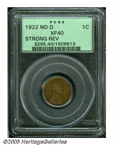 <B>1922 No D<1C> Strong Reverse XF40 PCGS.</B></I> FS-013.2. Die #2. A chocolate-brown representative of this desirable key date. The lines in the wheat ears are sharp, as is the final 2 in the date, both diagnostic of the variety. A mark on the reverse border near 3 o'clock reaches the right wheat ear. Encapsulated in an old green label holder.