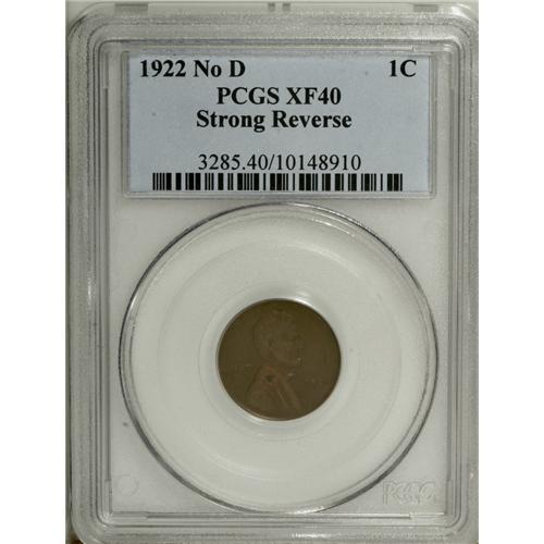 <B>1922 No D 1C Strong Reverse XF40 PCGS.</B></I> The Strong Reverse, coined from die pair 2, is the most popular variety of the 1922 No D cent, and commands the highest prices, as compared to die pairs 1 and 3. Medium brown surfaces are quite smooth, and are lacking in severe contact marks. A small dark area is noted on the lower part of Lincoln's collar.<BR><BR><b>Shipping:</b> Coin/Currency (<a target="_blank" href="http://www.heritageauctions.com/common/shipping.php">view shipping information</a>)