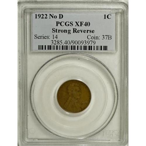 <B>1922 No D 1C Strong Reverse XF40 PCGS.</B></I> FS-013.2. Die Pair 2. A chocolate-brown beauty with a bold reverse and blurry obverse definition, diagnostic for this key <I>Guide Book</B></I> variety. The PCGS holder is a bit scuffy, but the coin itself is problem-free aside from a fleck or two of debris along the reverse border.<BR><BR><b>Shipping:</b> Coins & Currency (<a target="_blank" href="http://www.heritageauctions.com/common/shipping.php">view shipping information</a>)