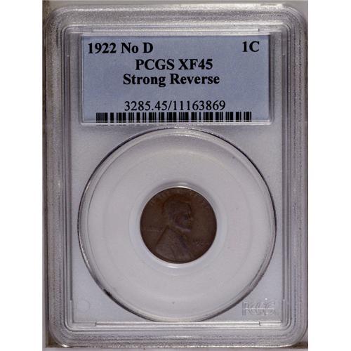 <B>1922 No D<1C> Strong Reverse XF45 PCGS.</B></I> A trifle flat on the obverse, as is normal on this scarce variety, with even, sharp detail on the opposite side that is more indicative of this coin's strong XF condition. Some deeper coloration is noted on Lincoln's portrait as the coin is turned under a light. The most desirable "1922 Plain" die pairing. <BR><BR><B>Important notice:</B> Heritage usually auctions material at the rate of 200-250 lots per hour. On some occasions eBay Live bid software or the Internet may not be able to keep up with the pace of the auction. We recommend placing a realistic absentee bid now as insurance to avoid disappointment. Occasionally the auctioneer may eliminate or reject an eBay Live bid, and the auctioneer may also reopen a lot after the close of the eBay live bidding (usually because we missed an audience bid), and may reject your bid even if it shows you as the winning bidder. By bidding via eBay Live, you agree that Heritage may award the lot to another bidder at its sole discretion under the circumstances described above or any other reasonable circumstances. Since eBay bids are not shown to us until we open the lot on the floor, we treat those bids just like floor bids. In most cases the floor responds before the eBay bid is presented to us, due to Internet lag time, so for consistency we have made it a policy that floor bids are always considered first over tie eBay live bids. Also please note that all Heritage lots purchased through eBay Live carry a 20% Buyer's Premium. Please make sure you read the Terms and Conditions before you bid. This lot is being auctioned in conjunction with a live floor auction by Heritage Galleries & Auctioneers. All final auction and invoice information will be supplied by Heritage Galleries & Auctioneers, and all other information should be considered preliminary. Lot:638 <BR><BR><B>Winning Notification and Billing:</B> After the FINAL session in this auction is complete, Heritage will send e-mail and snail mail invoices. This process normally takes several days. All final auction and invoice information will be supplied by Heritage Galleries & Auctioneers, and all other information should be considered preliminary. <BR><BR>This auction will be conducted on a live auction floor and over the Internet through eBay Live. If you choose to place an absentee bid, please take a moment to <font color='#0000ff'><u><a href='http://pages.ebay.com/liveauctions/help/before/laabsentee.html'>learn how eBay Live absentee bidding works</a></u></font><font color='#000000'>