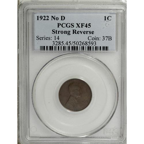 <B>1922 No D 1C Strong Reverse XF45 PCGS.</B></I> FS-013.2. Die Pair 2. Semi-glossy surfaces display light to medium brown patination. The obverse does not show the degree of detail that the reverse does, which is typical for this die pair. What appears to be a strike-thru is seen on the lower part of the right reverse wheat stalk.<BR><BR><b>Shipping:</b> Coin/Currency (<a target="_blank" href="http://www.heritageauctions.com/common/shipping.php">view shipping information</a>)