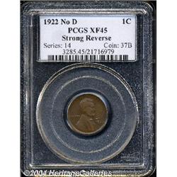 <B>1922 No D<1C> Strong Reverse XF45 PCGS.</B></I> A clean, glossy medium brown appearance greets the viewer. There are no mentionable marks or spots that so commonly occur on the coins. A perfect example for the collector of high grade, circulated Lincoln Cents. <BR><BR><B>Important notice:</B> Heritage usually auctions material at the rate of 200-250 lots per hour. On some occasions eBay Live bid software or the Internet may not be able to keep up with the pace of the auction. We recommend placing a realistic absentee bid now as insurance to avoid disappointment. Occasionally the auctioneer may eliminate or reject an eBay Live bid, and the auctioneer may also reopen a lot after the close of the eBay live bidding (usually because we missed an audience bid), and may reject your bid even if it shows you as the winning bidder. By bidding via eBay Live, you agree that Heritage may award the lot to another bidder at its sole discretion under the circumstances described above or any other reasonable circumstances. Since eBay bids are not shown to us until we open the lot on the floor, we treat those bids just like floor bids. In most cases the floor responds before the eBay bid is presented to us, due to Internet lag time, so for consistency we have made it a policy that floor bids are always considered first over tie eBay live bids. Also please note that all Heritage lots purchased through eBay Live carry a 20% Buyer's Premium. Please make sure you read the Terms and Conditions before you bid.