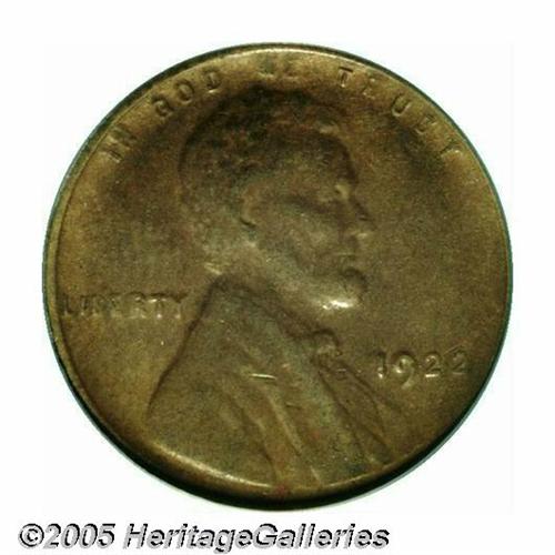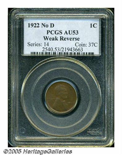 <B>1922 No D<1C> Weak Reverse AU53 PCGS.</B></I> A medium brown representative with sharp definition in the reverse center and weaker details on the obverse and reverse border. The soft definition on the peripheral legends and the portrait is not due to wear, but is the result of dies too long in use. A diagonal die crack (as made) crosses the O in ONE.