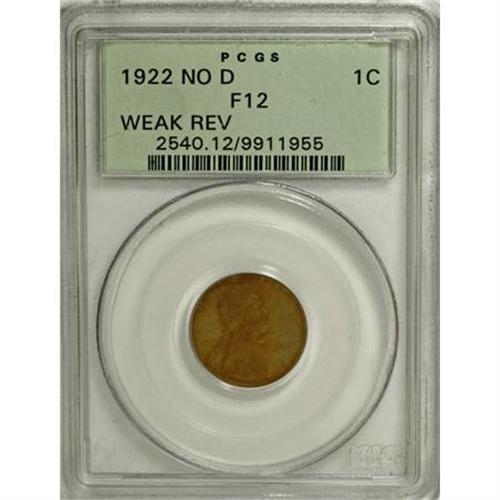 <B>1922 No D 1C Weak Reverse F12 PCGS.</B></I> PCGS Population (96/601). NGC Census: (142/1084). Mintage: 7,160,000. (#2540)<BR><BR><B>Coin Engraver:</B> Victor D. Brenner<BR><BR><b>Shipping:</b> Coins & Currency (<a target="_blank" href="http://www.heritageauctions.com/common/shipping.php">view shipping information</a>)