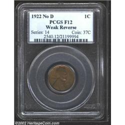 1922 No D 1C Weak Reverse Fine 12 PCGS. Evenly circulated and moderately abraded. Important notice: We expect to be auctioning lots at the rate of 200-250 per hour. Sometimes eBay Premier live bid software cannot keep up with that pace, so we strongly recommend that you place a realistic proxy bid now as insurance to avoid disappointment. Also please note that all Heritage/CAA lots purchased through eBay Premier carry a 20% Buyer's Premium. Please make sure you read the Terms and Conditions.