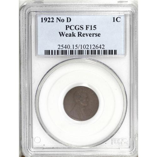 <B>1922 No D<1C> Weak Reverse Fine 15 PCGS.</B></I> Die pair 3. Moderate to heavy wear is exaggerated by notable weakness on IN GOD WE TRUST along the obverse border and by the wheat stalks and E PLURIBUS UNUM on the reverse. Essentially abrasion-free.