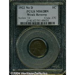 <B>1922 No D<1C> Weak Reverse MS62 Brown PCGS.</B></I> This popular variety was struck from a worn out obverse die that was further weakened by regrinding to efface clash marks. In its later states, this obverse die wore down so far that the mintmark eventually vanished. No new dies were available from the Engraving Department in Philadelphia at this time due to the increased attention being devoted to Peace dollars. The '22 No D is usually available only in low grades; it is very rare in Mint State. The MS62 example we offer here is thus a rare opportunity for the Lincoln cent specialist. Even, medium brown patination dominates each side, with glimpses of mint red fringing the rims and many of the design elements. The obverse devices are adequately defined, as are those in the central reverse. Typical weakness is apparent on the reverse periphery. Scattered unobtrusive and toned-over minor contact marks are noted, particularly on Lincoln's face and upper shoulder. Overall, a pleasing Mint State representative. Population: 1 in 62, 6 finer (9/04). <BR><BR><B>Important notice:</B> Heritage usually auctions material at the rate of 200-250 lots per hour. On some occasions eBay Live bid software or the Internet may not be able to keep up with the pace of the auction. We recommend placing a realistic absentee bid now as insurance to avoid disappointment. Occasionally the auctioneer may eliminate or reject an eBay Live bid, and the auctioneer may also reopen a lot after the close of the eBay live bidding (usually because we missed an audience bid), and may reject your bid even if it shows you as the winning bidder. By bidding via eBay Live, you agree that Heritage may award the lot to another bidder at its sole discretion under the circumstances described above or any other reasonable circumstances. Since eBay bids are not shown to us until we open the lot on the floor, we treat those bids just like floor bids. In most cases the floor responds before the eBay bid is presented to us, due to Internet lag time, so for consistency we have made it a policy that floor bids are always considered first over tie eBay live bids. Also please note that all Heritage lots purchased through eBay Live carry a 20% Buyer's Premium. Please make sure you read the Terms and Conditions before you bid.