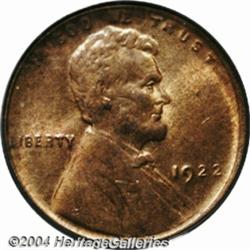 <B>1922 No D<1C> Weak Reverse MS63 Red PCGS.</B></I> Die Pair #3. The shimmering gold and rose surfaces are lightly abraded and have only a hint of carbon. Although not as heralded as its Strong Reverse counterpart, the Weak Reverse 1922 No D is nonetheless rarely encountered in Red Uncirculated grades. According to David W. Lange, the mintmark is absent on the two Weak Reverse die pairs due to "grease and other contaminants filling the mintmark cavity of the obverse dies." The borders are blurry, as made from worn-out dies. Population: 4 in 63, 2 finer (2/04). <BR><BR><B>Important notice:</B> Heritage usually auctions material at the rate of 200-250 lots per hour. On some occasions eBay Live bid software or the Internet may not be able to keep up with the pace of the auction. We recommend placing a realistic absentee bid now as insurance to avoid disappointment. Occasionally the auctioneer may eliminate or reject an eBay Live bid, and the auctioneer may also reopen a lot after the close of the eBay live bidding (usually because we missed an audience bid), and may reject your bid even if it shows you as the winning bidder. By bidding via eBay Live, you agree that Heritage may award the lot to another bidder at its sole discretion under the circumstances described above or any other reasonable circumstances. Since eBay bids are not shown to us until we open the lot on the floor, we treat those bids just like floor bids. In most cases the floor responds before the eBay bid is presented to us, due to Internet lag time, so for consistency we have made it a policy that floor bids are always considered first over tie eBay live bids. Also please note that all Heritage lots purchased through eBay Live carry a 20% Buyer's Premium. Please make sure you read the Terms and Conditions before you bid. </span></font></tr></table></td></tr></table>