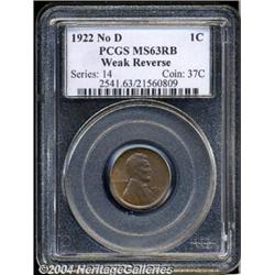 <B>1922 No D<1C> Weak Reverse MS63 Red and Brown PCGS.</B></I> Glossy with ample evidence of sunset-orange coloration in the protected areas. The wheat stalks display characteristic deficiency in strike and the D mintmark is only faintly visible, being positioned just to the left of the first 2 in the date. Population: 17 in 63, 7 finer (3/04).<BR><I>From The Barry Donnell Collection.</B></I> <BR><BR><B>Important notice:</B> Heritage usually auctions material at the rate of 200-250 lots per hour. On some occasions eBay Live bid software or the Internet may not be able to keep up with the pace of the auction. We recommend placing a realistic absentee bid now as insurance to avoid disappointment. Occasionally the auctioneer may eliminate or reject an eBay Live bid, and the auctioneer may also reopen a lot after the close of the eBay live bidding (usually because we missed an audience bid), and may reject your bid even if it shows you as the winning bidder. By bidding via eBay Live, you agree that Heritage may award the lot to another bidder at its sole discretion under the circumstances described above or any other reasonable circumstances. Since eBay bids are not shown to us until we open the lot on the floor, we treat those bids just like floor bids. In most cases the floor responds before the eBay bid is presented to us, due to Internet lag time, so for consistency we have made it a policy that floor bids are always considered first over tie eBay live bids. Also please note that all Heritage lots purchased through eBay Live carry a 20% Buyer's Premium. Please make sure you read the Terms and Conditions before you bid.