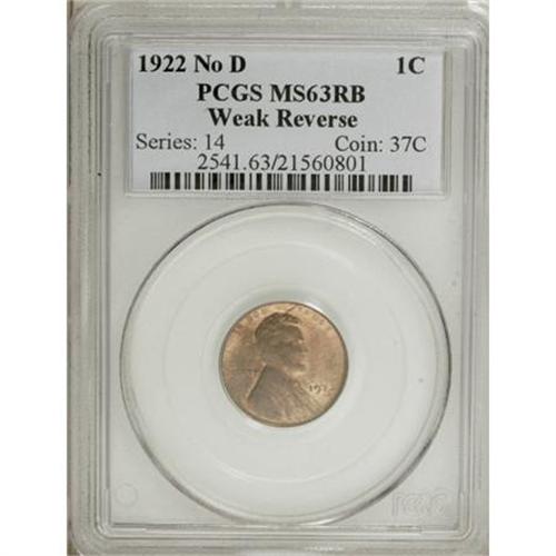 <B>1922 No D 1C Weak Reverse MS63 Red and Brown PCGS.</B></I> Die Pair 3. Other than characteristic softness of definition over the reverse, there are no apparent problems on either side of this important example. Cherry-red luster intermingles with golden-brown patina to form a pleasingly original appearance. The number of minute contact marks and carbon flecks are consistent with the grade, but both sides present uncommonly well for the issue.<BR> Unlike coins from Die Pair 2, those from Die Pairs 1 and 3 were struck from severely worn obverse and reverse dies. The absence of the mintmark on examples of the latter two varieties is believed to be due to grease that filled the mintmark cavity during production. Although the grease lifted from the obverse die in later die states (with the result that the D is partially visible on some Die Pair 1 and 3 coins), the present example shows no evidence of the mintmark. Examples of all three die pairs are elusive in Mint State because this error was not widely recognized until several years after production. Population: 20 in 63 Red and Brown, 9 finer (11/07).<BR><I>From The New York Eye Appeal Collection, Part Three.</B></I><BR><BR><B>Coin Engraver:</B> Victor D. Brenner<BR><BR><b>Shipping:</b> Coins & Currency (<a target="_blank" href="http://www.heritageauctions.com/common/shipping.php">view shipping information</a>)