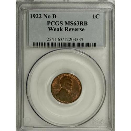 <B>1922 No D 1C Weak Reverse MS63 Red and Brown PCGS.</B></I> Though not as ardently desired as the Strong Reverse No D cents from this issue, the Weak Reverse examples have found homes with many appreciative collectors. This luminous piece, which shows a blend of pale copper-gold and deeper walnut-brown on the surfaces, has typically soft definition on both obverse and reverse. Light abrasions are present on the portrait.<BR><BR><B>Coin Engraver:</B> Victor D. Brenner<BR><BR><b>Shipping:</b> Coins & Currency (<a target="_blank" href="http://www.heritageauctions.com/common/shipping.php">view shipping information</a>)