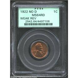 1922 No D 1C Weak Reverse MS64 Red PCGS. Die Pair Three. Whereas 1922 No D Cents of Die Pair Two are missing the mintmark due to overpolishing, those of Die Pairs One and Three are believed to owe their existence to filled dies. At some time during production with the latter dies, grease, dirt, or some other kind of foreign matter came into contact with the obverse and settled in the D mintmark cavity. The amount of contaminant present, as well as how deeply it had settled into the cavity, explains why Die Pairs One and Three have yielded coins of both the Weak D and No D varieties. The present near-Gem is devoid of any trace of the mintmark. Severely worn dies are the norm for this pairing, and both sides are noticeably soft in overall detail. The presence of complete luster and the absence of singularly distracting blemishes, however, ensure this coin's status as one of the finest Weak Reverse examples extant. Pink-red in color. Population: 2 in 64 Red, there are none finer (10/02). Important notice: We expect to be auctioning lots at the rate of 200-250 per hour. Sometimes eBay Premier live bid software cannot keep up with that pace, so we strongly recommend that you place a realistic proxy bid now as insurance to avoid disappointment. Also please note that all Heritage/CAA lots purchased through eBay Premier carry a 20% Buyer's Premium. Please make sure you read the Terms and Conditions.