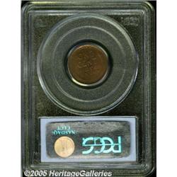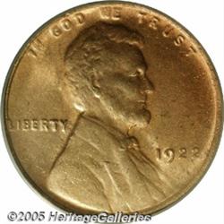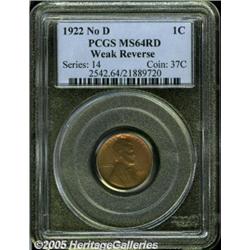 <B>1922 No D 1C Weak Reverse MS64 Red PCGS.</B></I> Die Pair Three. Whereas 1922 No D Cents of Die Pair Two are missing the mintmark due to overpolishing, those of Die Pairs One and Three are believed to owe their existence to filled dies. At some time during production with the latter dies, grease, dirt, or some other kind of foreign matter came into contact with the obverse and settled in the D mintmark cavity. The amount of contaminant present, as well as how deeply it had settled into the cavity, explains why Die Pairs One and Three have yielded coins of both the Weak D and No D varieties. The present near-Gem is devoid of any trace of the mintmark. Severely worn dies are the norm for this pairing, and both sides are noticeably soft in overall detail. The presence of complete luster and the absence of singularly distracting blemishes, however, ensure this coin's status as one of the finest Weak Reverse examples extant. There are traces of carbon and a few scattered blemishes that keep the piece from Gem status. Population: 3 in 64 Red, 0 finer (2/05).