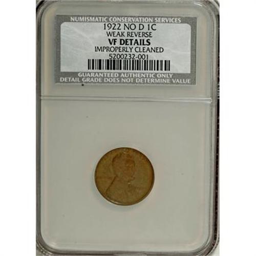 <B>1922 No D 1C Weak Reverse--Improperly Cleaned--NCS. VF Details.</B></I> This somewhat bright example has unnaturally light green-gold surfaces. The reverse rim has a small nick at 4:30, and the obverse has thin brief marks on the jaw and left obverse field.<BR><BR><B>Coin Engraver:</B> Victor D. Brenner<BR><BR><b>Shipping:</b> Coins & Currency (<a target="_blank" href="http://www.heritageauctions.com/common/shipping.php">view shipping information</a>)