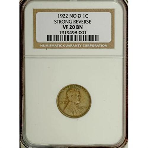 <B>1922 No D 1C Strong Reverse VF20 NGC.</B></I> FS-401, formerly FS-013.2. Die Pair 2. A moderately worn teak-brown exemplar from the most desirable of the No D die pairs. The sharpness of the wheat ears on the minimally marked reverse is unmistakable.<BR><BR><B>Coin Engraver:</B> Victor D. Brenner<BR><BR><b>Shipping:</b> Coins & Currency (<a target="_blank" href="http://www.heritageauctions.com/common/shipping.php">view shipping information</a>)