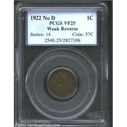 1922 No D 1C Weak Reverse VF25 PCGS. Chocolate brown in color with even wear and no detracting marks