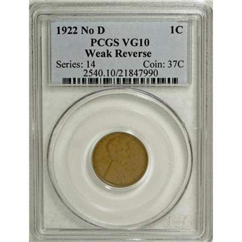 <B>1922 No D 1C Weak Reverse VG10 PCGS.</B></I> PCGS Population (104/697). NGC Census: (77/1226). Mintage: 7,160,000. (#2540)<BR><BR><B>Coin Engraver:</B> Victor D. Brenner<BR><BR><b>Shipping:</b> Coins & Currency (<a target="_blank" href="http://www.heritageauctions.com/common/shipping.php">view shipping information</a>)