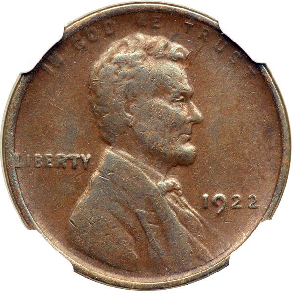 1922 No D Strong Reverse. NGC graded AU-53 Brown. A popular variety. Among the more poorly defined issues in the series due to extensive die wear on the obverse die, this still-lustrous example breaks that trend slightly and displays more detail on the highest points of the design. Even the normal softness on the motto is mostly absent. Both sides are graced with natural medium brown hues. Very sharp wheat ears. Pop 14; 99 finer .