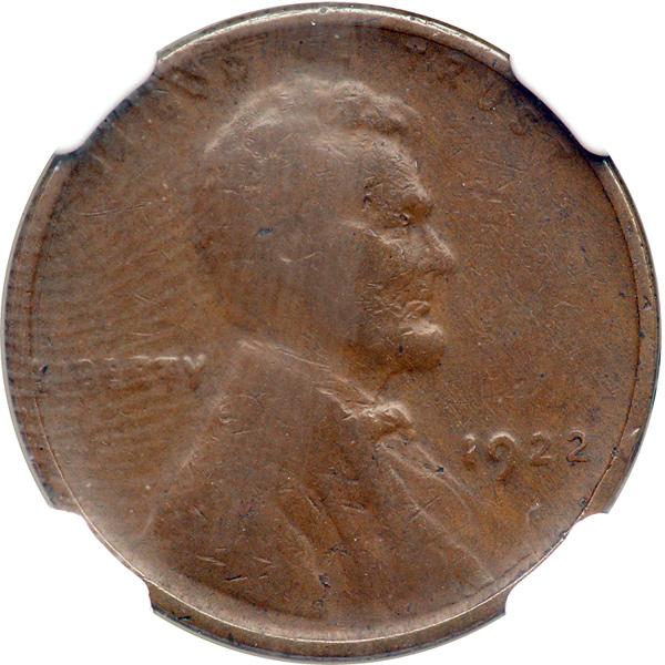1922 No D Strong Reverse. NGC graded VF-20 Brown. Medium-deep brown patina with occasional weakness on the obverse motto due to the worn state of the die which struck this variety. A desirable coin, first-time collectors seeing it do not realize it was struck at the Denver Mint but has lost its D due to die wear and occlusion at the Mint.