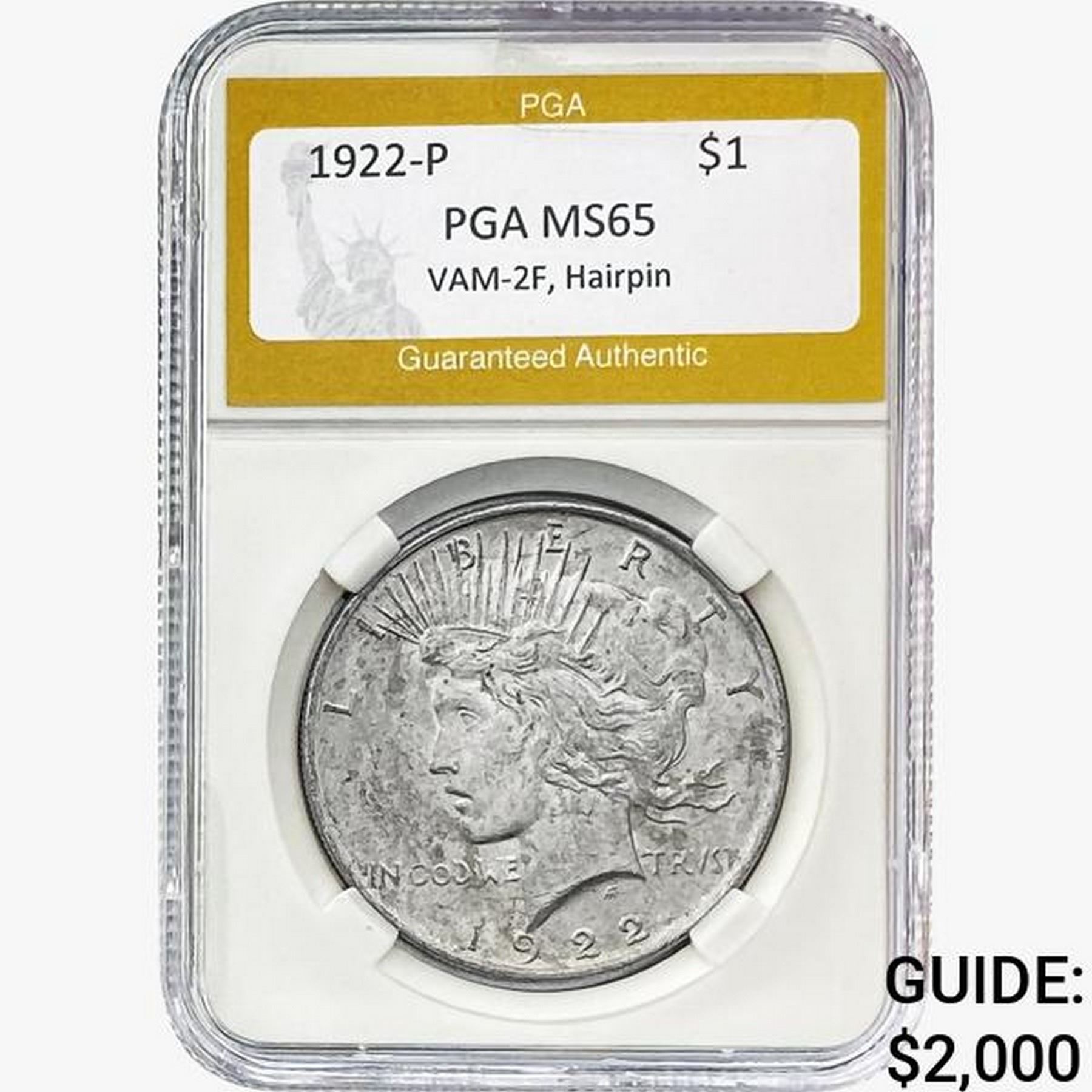 1922-P Silver Peace Dollar PGA MS65 HAIR PIN