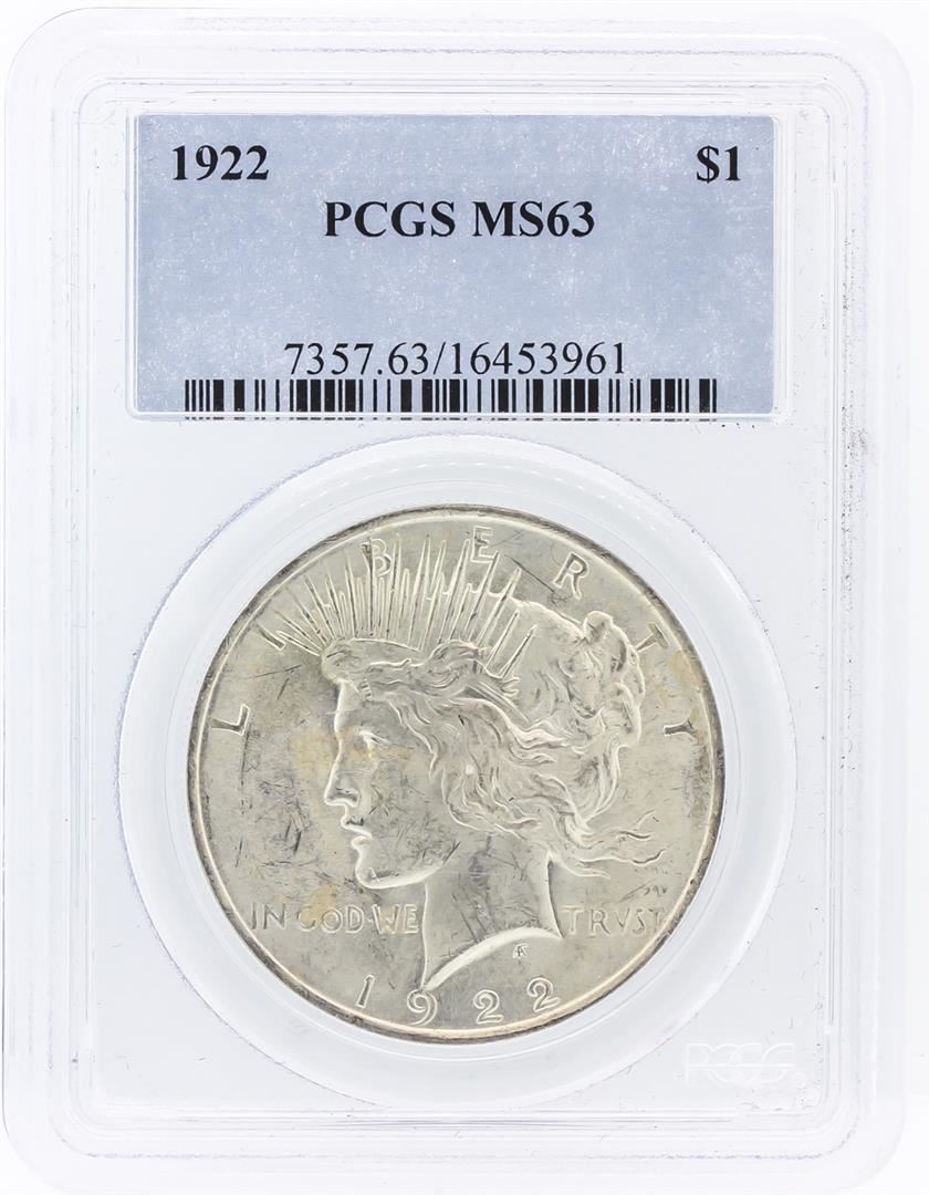 One 1922 PCGS MS63 Peace Silver Dollar. PCGS Certified.