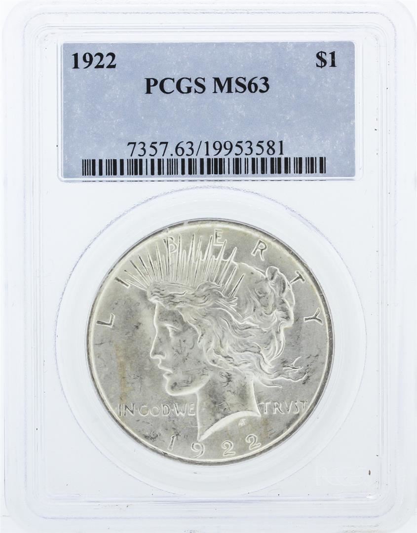 One 1922 PCGS MS63 Peace Silver Dollar. PCGS Certified.