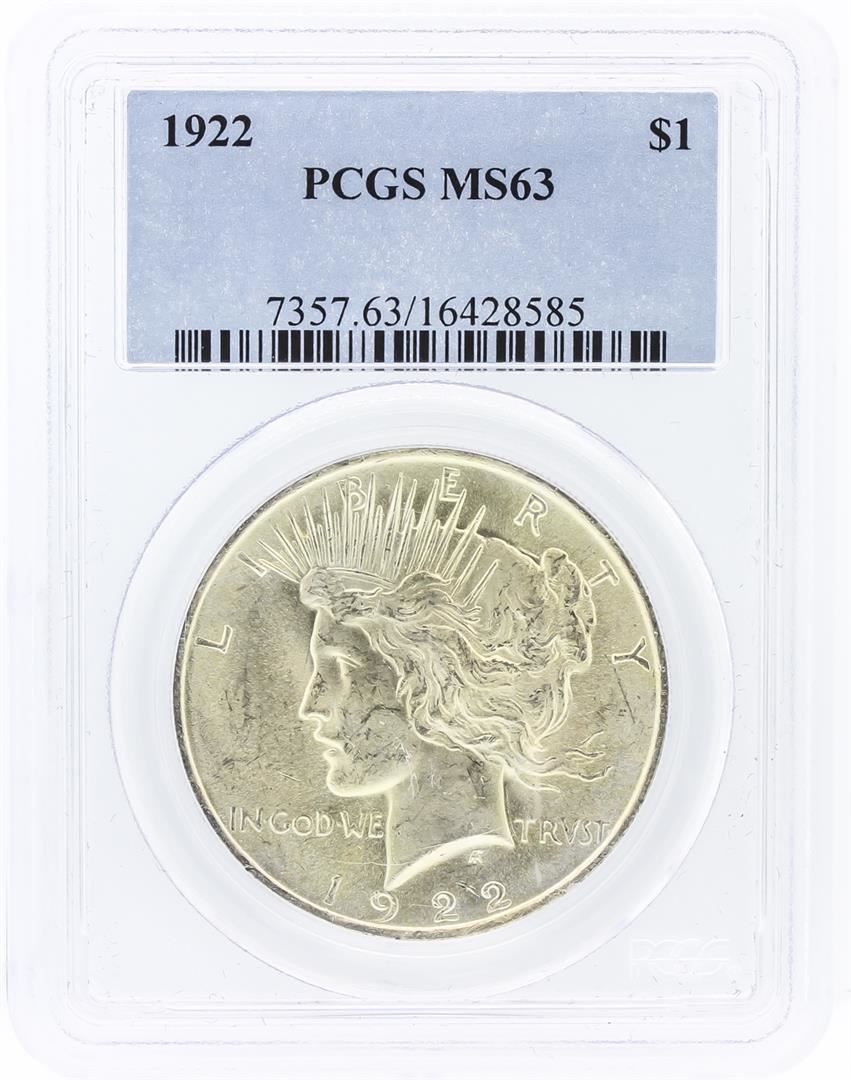 One 1922 PCGS MS63 Peace Silver Dollar. PCGS Certified.