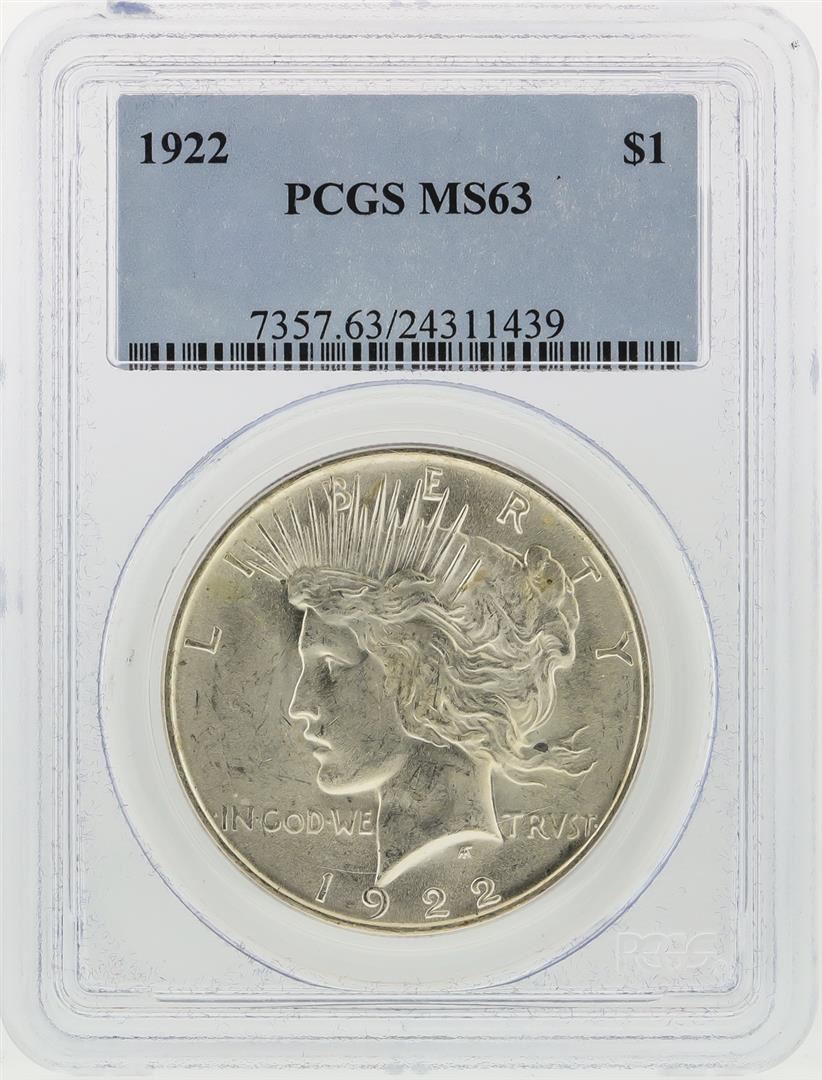 One 1922 PCGS MS63 Peace Silver Dollar. PCGS Certified.