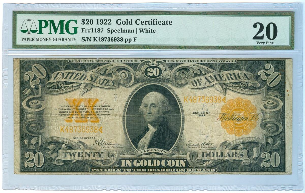 One 1922 PMG VF 20 $20 Gold Certificate.