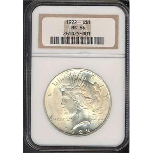 <b>1922 Peace Dollar. NGC graded MS66.</b> An outrageously fresh white example of this important date, with stark contrast between the satiny fields and significantly bold devices. Soft-edged devices and lettering throughout the centers are often a problem on this Peace dollar design, as commonly seen; however, a small percentage of this year's production is found with enough convincing detail to be called "bold" and this is one such coin! <b>(PCGS # 7357)</b>