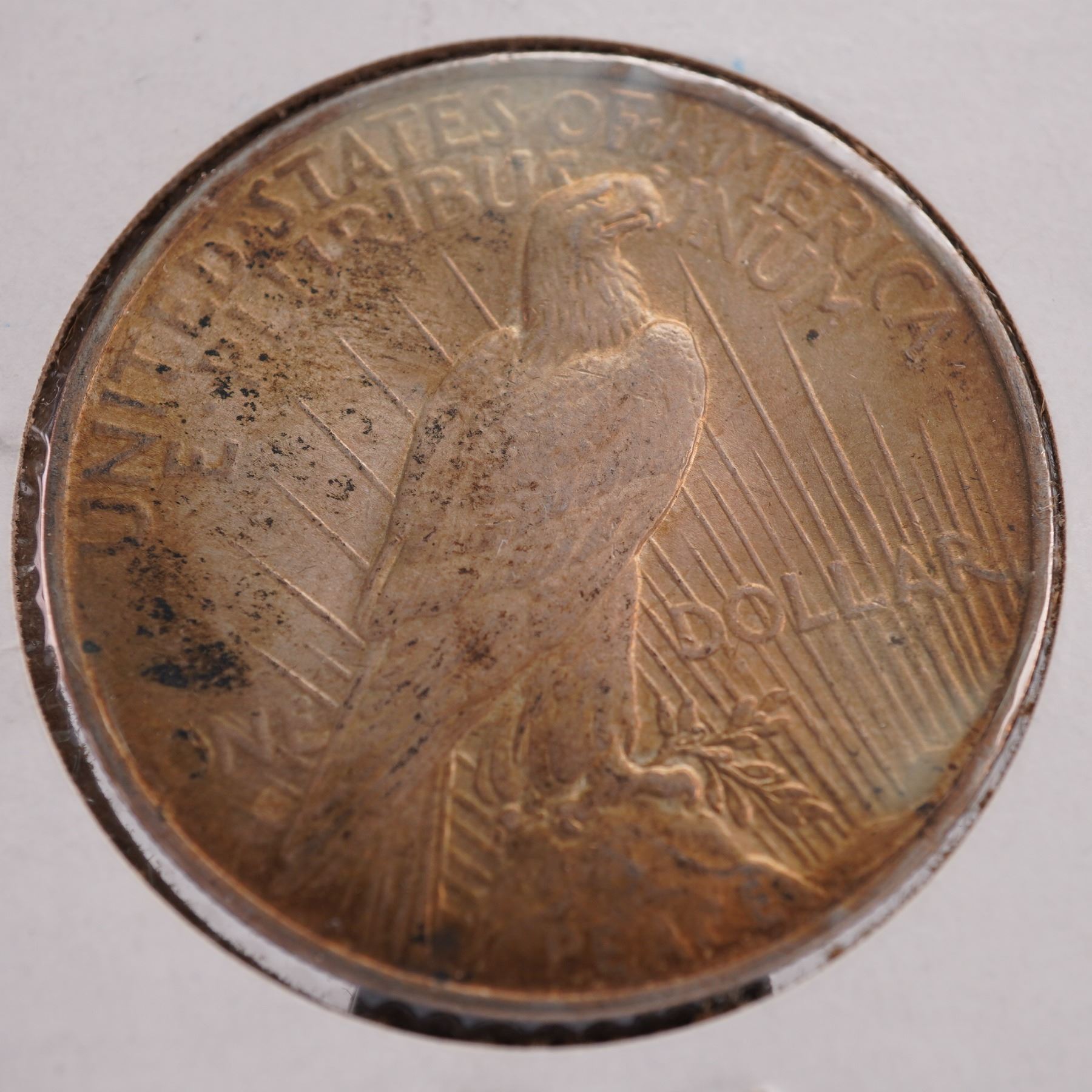 A 1922 Peace Silver Dollar struck in 90% silver. The face, bearing the classically inspired profile of Lady Liberty crowned with radiant spikes, emblematic of illumination and national strength, with inscriptions LIBERTY, IN GOD WE TRVST, and the date 1922 precisely arranged. The reverse presents a poised bald eagle clutching an olive branch atop a rocky perch, gazing toward the horizon with rays of light radiating from behind, surrounded by the inscriptions UNITED STATES OF AMERICA, E PLURIBUS UNUM, ONE DOLLAR, and PEACE. Enclosed in a cardboard holder. Holder measures: 2"L x 2"H. Coin diameter: 38.1 mm.