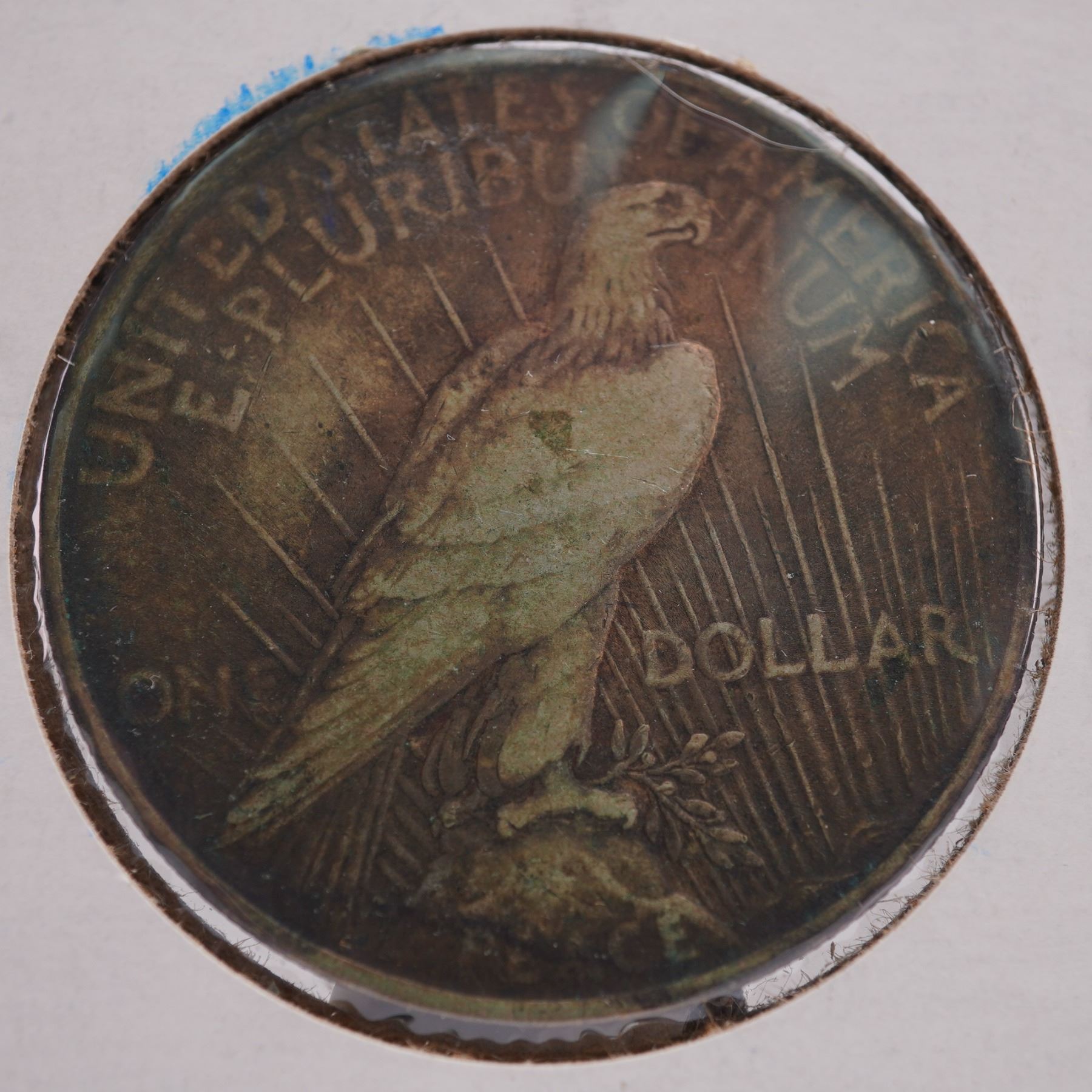 Struck at the Denver Mint, this 1922-D minted in .999 fine silver. The obverse features the serene left-facing profile of Lady Liberty, her hair swept back beneath a radiant crown symbolic of postwar ideals and national rejuvenation. Encircled with LIBERTY, IN GOD WE TRVST, and the date 1922 below. The reverse presents a majestic bald eagle resting upon a rocky outcrop, clutching an olive branch and illuminated by rays of light, with inscriptions reading UNITED STATES OF AMERICA, E PLURIBUS UNUM, ONE DOLLAR, and PEACE. Enclosed in a cardboard holder. Holder measures: 2"L x 2"H. Coin diameter: 38.1 mm.