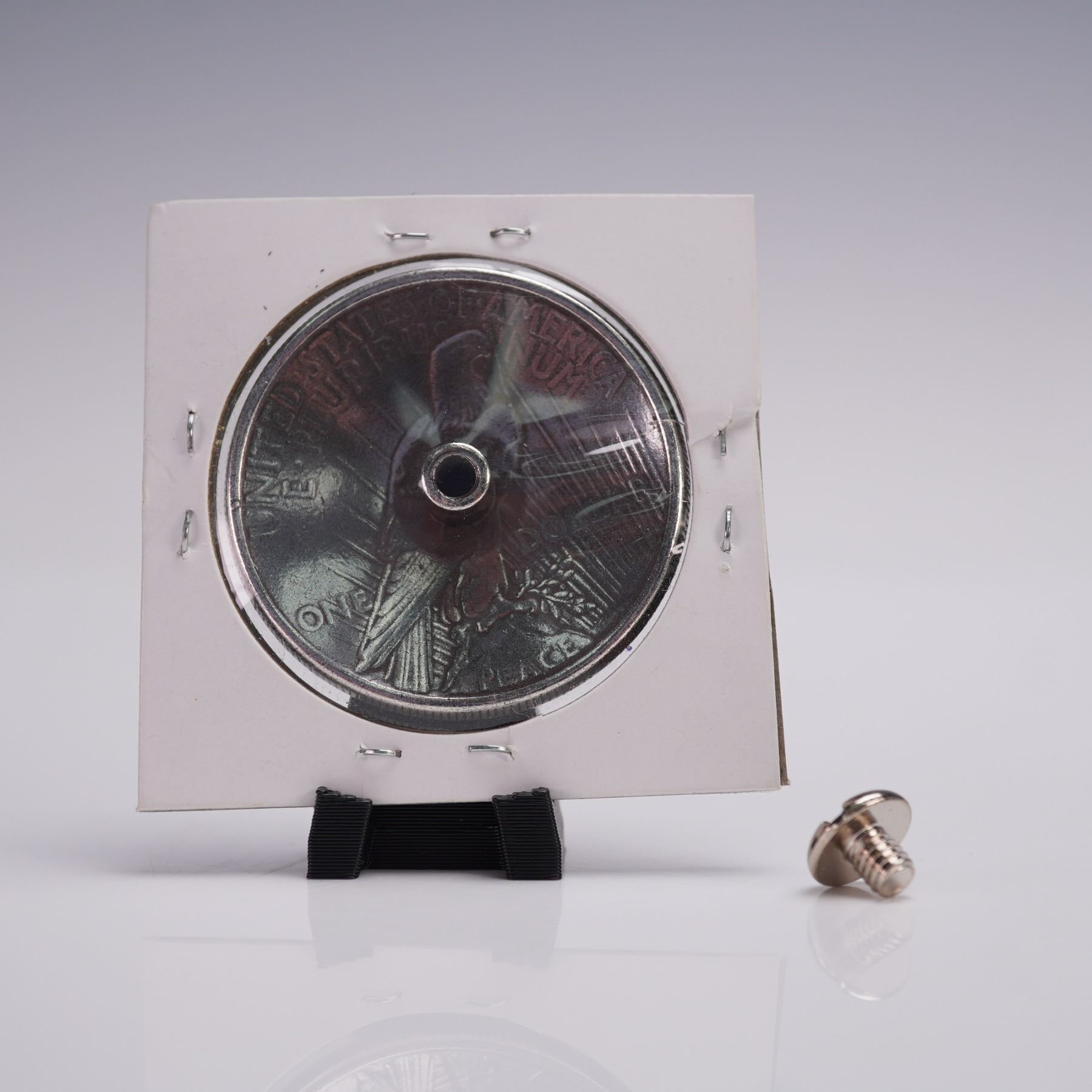 Modified from an original 1922 Peace Silver Dollar, this coin concho features the classic design of Lady Liberty on the obverse side, facing left with a radiating crown inscribed with the word LIBERTY above and IN GOD WE TRVST below. The reverse side depicts a perched bald eagle with wings folded, resting on a rock and clutching an olive branch in its talons, with rays emanating from the background and the word PEACE inscribed at the bottom. The concho has been drilled and fitted with a threaded screw back, allowing it to be mounted onto leather accessories or gear. A coin concho is a decorative element crafted from a coin and fitted with hardware, often used to embellish belts, saddles, handbags, or other leather goods. This piece is marked as VF (Very Fine), indicating moderate wear with clear major details. Includes the screw backing shown alongside. Coin diameter: 38.1mm. Protective case: 2"L x 2"W.