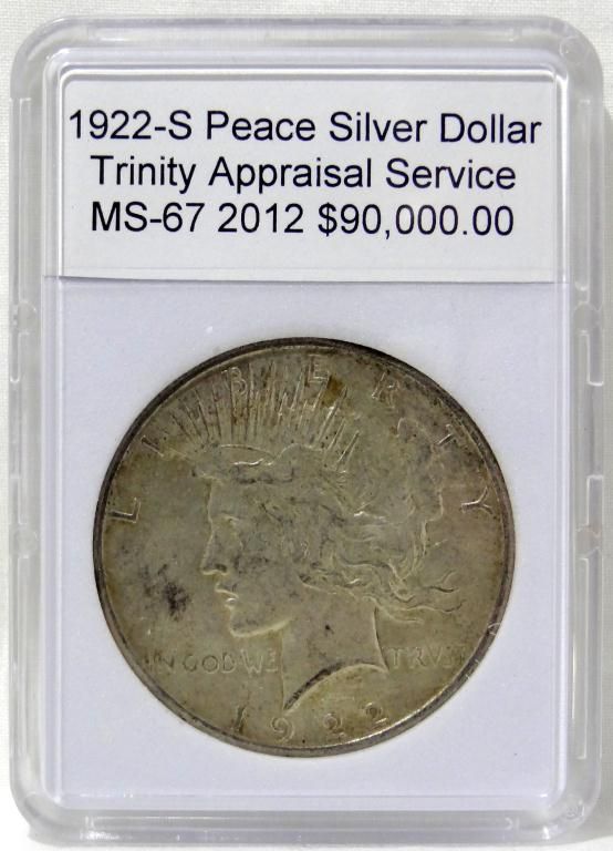 EXTREMELY RARE IN THIS GRADE!! America's last silver dollar struck for circulation, the "Peace" dollar emerged after World War I. The inscription "PEACE" appears on the rock on which the vigilant American Eagle stands guard for freedom, in the brilliant dawn of a new era. On the obverse is an ardent personification of Liberty, partly inspired by the Statue of Liberty. The spires of her crown echo the sunrays on the opposite side. This early 1922 Philadelphia Mint issue introduced the modified-relief engravings that became the standard for the series, which ended in 1935. This High Quality Coin highlights every detail on these magnificent engravings .Includes Appraisal Certificate in the amount of $90,000.00.