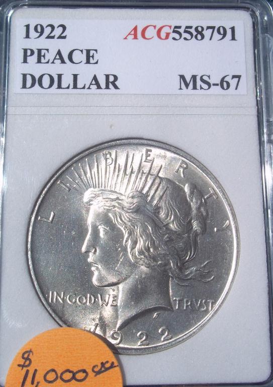 Certified and graded Mint State 67 by Accugrade. Accugrade is one of America’s oldest and most respected grading services, and has been in business since 1984! Philadelphia mint 1922 coins were notoriously weakly struck; this one is the exception! So sharply struck it can almost cut you!! A terrific opportunity for a smart investor!