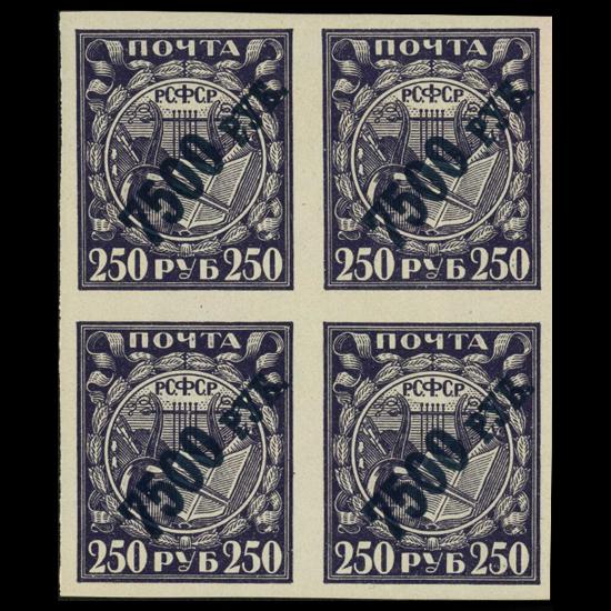 1922 RARE Early Soviet 7500 Ruble Overprint Mint Postage Stamp Imperforate Block of 4 (STM-0345)