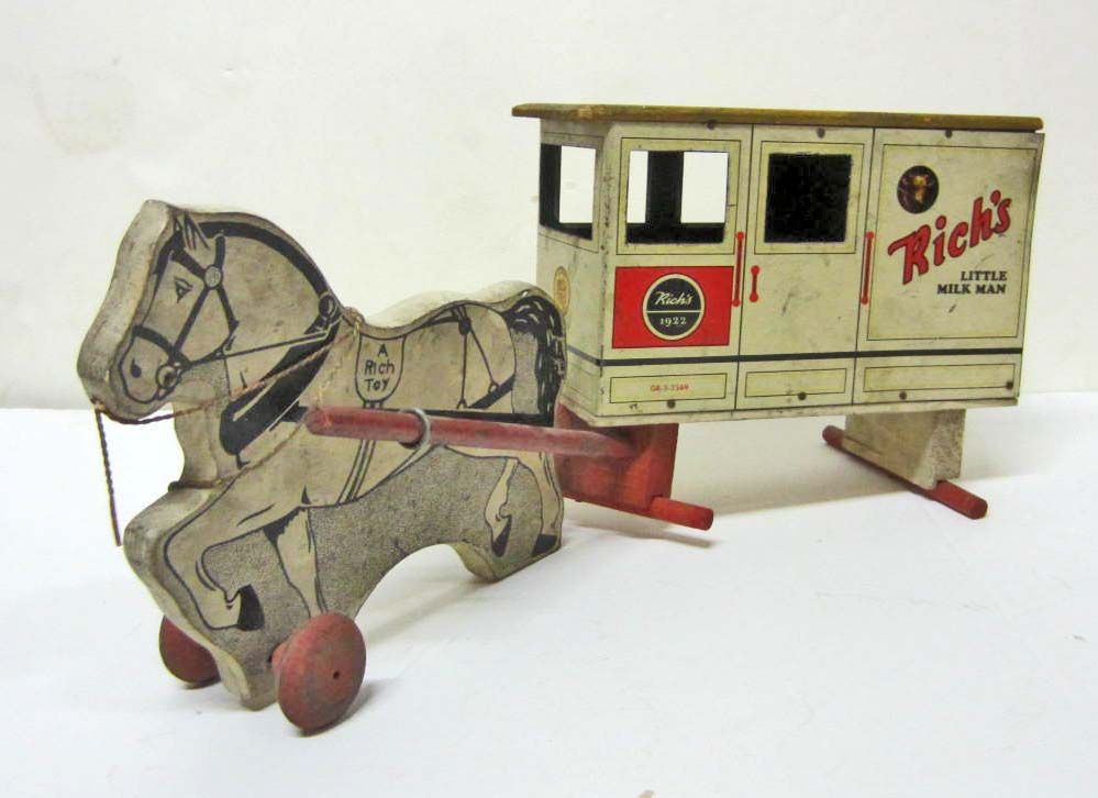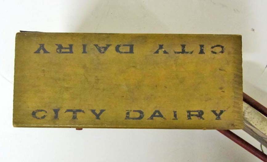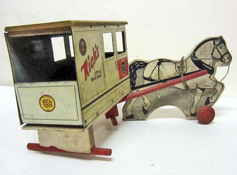21" long made of wood and tin litho. Wagon is missing all 4 wheels. Tin lithograph wagon has some wear and scratches. Tailgate moves up and down.