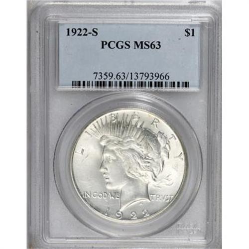 <B>1922-S $1 MS63 PCGS.</B></I> PCGS Population (1571/1497). NGC Census: (1267/1631). Mintage: 17,475,000. Numismedia Wsl. Price for NGC/PCGS coin in MS63: $55. (#7359)<BR><BR><B>Coin Engraver:</B> Anthony de Francisci<BR><BR><b>Shipping:</b> Coins & Currency (<a target="_blank" href="http://www.heritageauctions.com/common/shipping.php">view shipping information</a>)