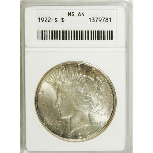 <B>1922-S $1 MS64 ANACS.</B></I> NGC Census: (1369/200). PCGS Population (1182/216). Mintage: 17,475,000. Numismedia Wsl. Price for NGC/PCGS coin in MS64: $200. (#7359)<BR><BR><b>Shipping:</b> Coins & Currency (<a target="_blank" href="http://www.heritageauctions.com/common/shipping.php">view shipping information</a>)