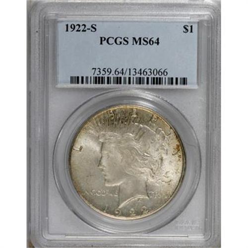 <B>1922-S $1 MS64 PCGS.</B></I> PCGS Population (1242/225). NGC Census: (1406/205). Mintage: 17,475,000. Numismedia Wsl. Price for NGC/PCGS coin in MS64: $200. (#7359)<BR><BR><B>Coin Engraver:</B> Anthony de Francisci<BR><BR><b>Shipping:</b> Coins & Currency (<a target="_blank" href="http://www.heritageauctions.com/common/shipping.php">view shipping information</a>)