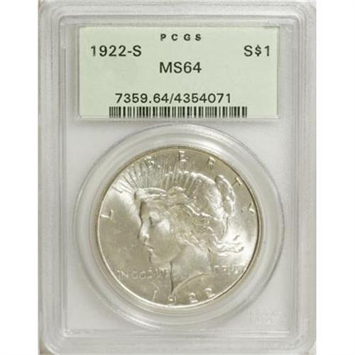 <B>1922-S $1 MS64 PCGS.</B></I> PCGS Population (1216/221). NGC Census: (1397/206). Mintage: 17,475,000. Numismedia Wsl. Price for NGC/PCGS coin in MS64: $200. (#7359)<BR><BR><B>Coin Engraver:</B> Anthony de Francisci<BR><BR><b>Shipping:</b> Coins & Currency (<a target="_blank" href="http://www.heritageauctions.com/common/shipping.php">view shipping information</a>)