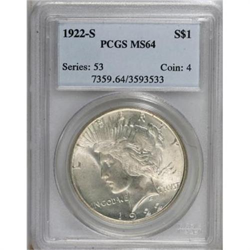 <B>1922-S $1 MS64 PCGS.</B></I> PCGS Population (1257/225). NGC Census: (1406/205). Mintage: 17,475,000. Numismedia Wsl. Price for NGC/PCGS coin in MS64: $200. (#7359)<BR><BR><B>Coin Engraver:</B> Anthony de Francisci<BR><BR><b>Shipping:</b> Coins & Currency (<a target="_blank" href="http://www.heritageauctions.com/common/shipping.php">view shipping information</a>)