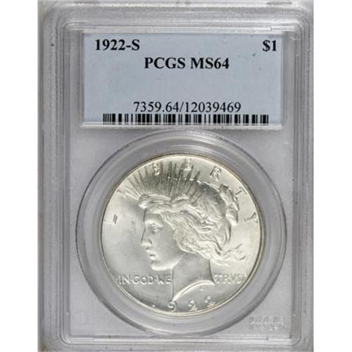 <B>1922-S $1 MS64 PCGS.</B></I> PCGS Population (1265/234). NGC Census: (1422/209). Mintage: 17,475,000. Numismedia Wsl. Price for NGC/PCGS coin in MS64: $200. (#7359)<BR><BR><B>Coin Engraver:</B> Anthony de Francisci<BR><BR><b>Shipping:</b> Coins & Currency (<a target="_blank" href="http://www.heritageauctions.com/common/shipping.php">view shipping information</a>)