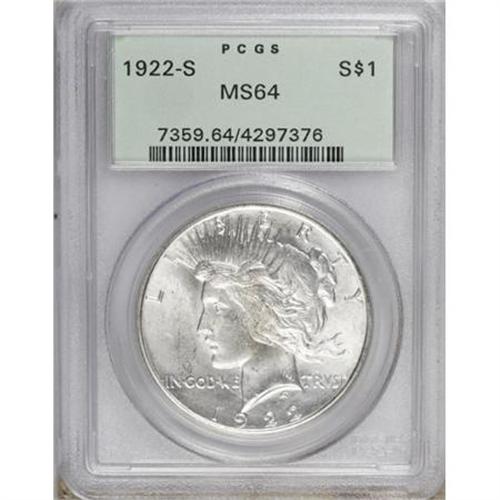 <B>1922-S $1 MS64 PCGS.</B></I> PCGS Population (1286/240). NGC Census: (1434/213). Mintage: 17,475,000. Numismedia Wsl. Price for NGC/PCGS coin in MS64: $220. (#7359)<BR><BR><B>Coin Engraver:</B> Anthony de Francisci<BR><BR><b>Shipping:</b> Coins & Currency (<a target="_blank" href="http://www.heritageauctions.com/common/shipping.php">view shipping information</a>)