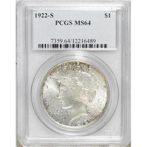 <B>1922-S $1 MS64 PCGS.</B></I> . PCGS Population (1307/241). NGC Census: (1436/216). Mintage: 17,475,000. Numismedia Wsl. Price for NGC/PCGS coin in MS64: $220. (#7359)<BR><BR><B>Coin Engraver:</B> Anthony de Francisci<BR><BR><b>Shipping:</b> Coins & Currency (<a target="_blank" href="http://www.heritageauctions.com/common/shipping.php">view shipping information</a>)