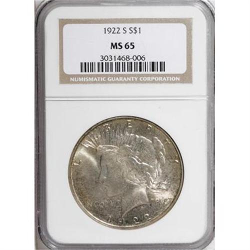 <B>1922-S $1 MS65 NGC.</B></I> Despite the 1922-S issue's reputation as common, examples are elusive in Gem, and anything finer is a condition rarity. This strongly lustrous piece, shining silver-gray in the centers with ample tan and rose shadings in the obverse fields, is pleasingly preserved and remarkably appealing. NGC has graded just 11 numerically finer coins (3/08).<BR><BR><B>Coin Engraver:</B> Anthony de Francisci<BR><BR><b>Shipping:</b> Coins & Currency (<a target="_blank" href="http://www.heritageauctions.com/common/shipping.php">view shipping information</a>)