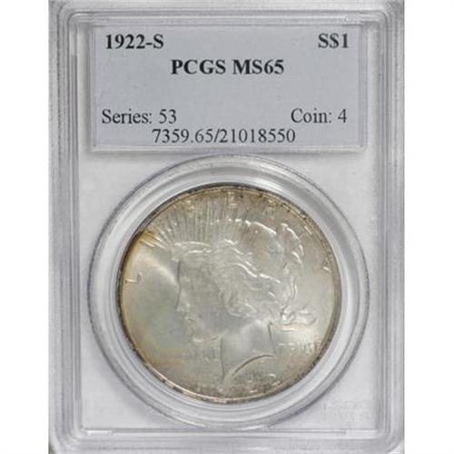 <B>1922-S $1 MS65 PCGS.</B></I> The exquisite surfaces of this second-year Gem, strongly lustrous with a hint of satin, offer colorful lemon-gold, orange, tan, and ice-blue toning overall with splashes of crimson on the rims. Well struck with solid visual appeal.<BR><BR><B>Coin Engraver:</B> Anthony de Francisci<BR><BR><b>Shipping:</b> Coins & Currency (<a target="_blank" href="http://www.heritageauctions.com/common/shipping.php">view shipping information</a>\)