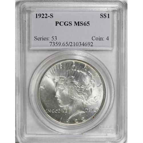 <B>1922-S $1 MS65 PCGS.</B></I> For an issue that typically comes poorly struck, this Gem offers good definition on the design features. Most of the hair curls are nicely delineated, are as are most of the eagle's plumage. Untoned surfaces exhibit dazzling luster and no mentionable marks. A really pleasing coin for a '22-S!<BR><BR><B>Coin Engraver:</B> Anthony de Francisci<BR><BR><b>Shipping:</b> Coins & Currency (<a target="_blank" href="http://www.heritageauctions.com/common/shipping.php">view shipping information</a>\)